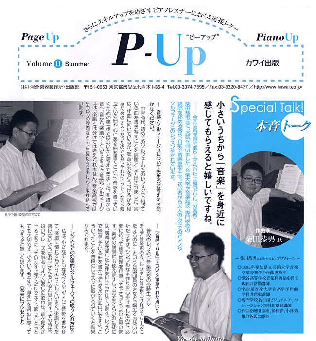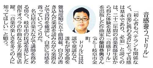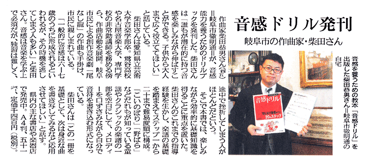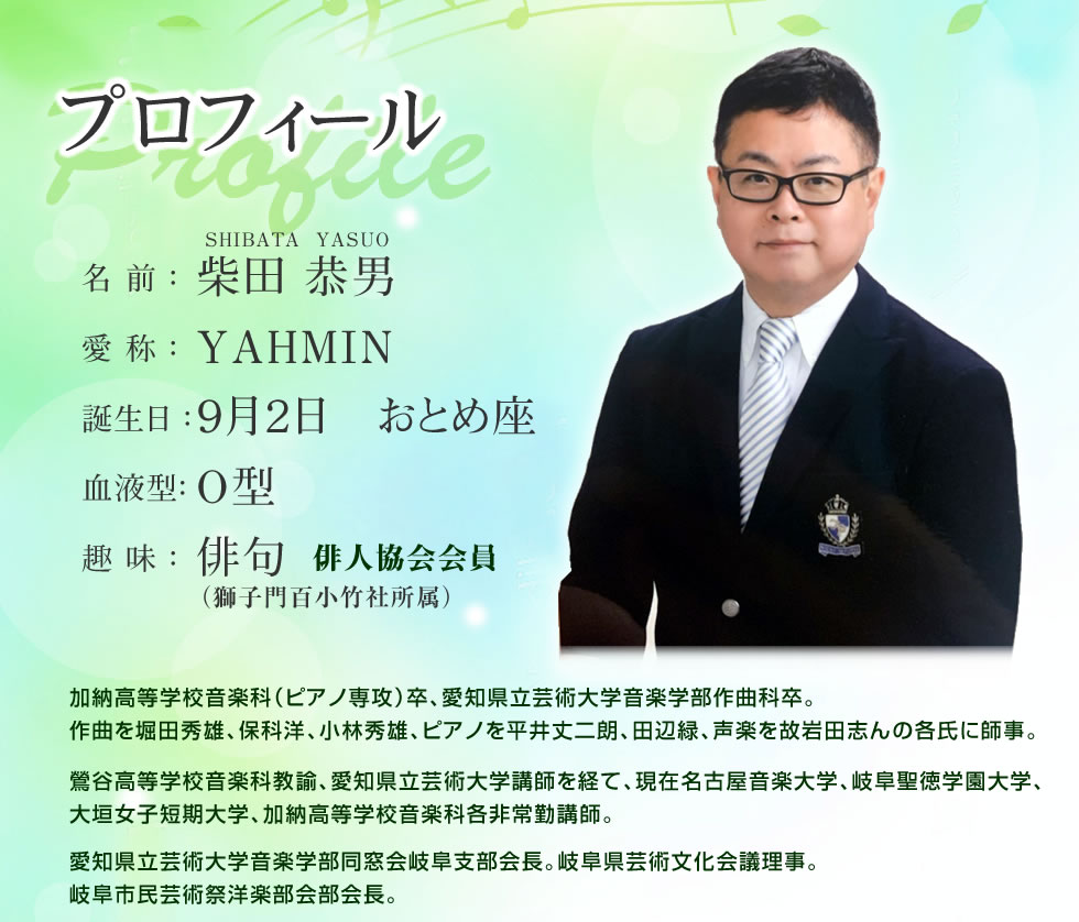 柴田 恭男(作曲) プロフィール 1961年、岐阜市生まれ。加納高等学校音楽科卒業。 愛知県立芸術大学音楽学部音楽学科作曲専攻卒。 作曲を堀田秀雄、保科洋、小林秀雄の各氏に師事。 1998年2月、二重唱曲「森からのおくりもの」でNEC主催「ムジカノーヴァ音楽祭」作曲賞受賞。 2000年8月、第1回作品演奏会を岐阜市文化センターにて開催。 2001年3月、創作音楽劇「尾なし龍」を岐阜市民会館にて作曲・上演(市民の劇場200回記念)。 2002年7月、大阪・フェニックスホールにおいてオンド・マルトノのための作品発表。2004年3月、創作音楽劇「おくわ堤」を岐阜市民会館にて作曲・上演。同8月、中国杭州市において「尾なし龍」を日中合作上演(岐阜市・杭州市友好姉妹都市締結25周年記念)。同11月、岐阜市文化センターにおいて「尾なし龍」を再々演。(文化センター設立25周年記念)。 同12月、第2回作品演奏会を東京・Hakuju Hall、岐阜市文化センターにおいて同時開催。 2006年2月、高山市民文化会館において創作音楽劇「山城秘話」を作曲・上演(平成17年度岐阜県民文化祭)。 同12月、美濃市文化会館にて「尾なし龍」ハイライト上演(平成18年度岐阜県民文化祭)。 同12月、電気文化会館コンサートホールにて、作品発表(名古屋音楽大学主催)。 2007年2月、カワイ出版より「音感ドリル」著作出版。同10月、サラマンカホールにて童歌による創作合唱劇「鬼は外、福は内」を作曲・上演。同10月、宗次ホールにて、オンド・マルトノのための新作発表。 同12月高山市民文化会館において創作音楽劇「一助の堤」を作曲・上演(平成19年度岐阜県民文化祭)。 2008年12月、電気文化会館コンサートホールにおいて作品発表。2009年2月、熱田文化小劇場においてオンド・マルトノのための作品を2曲録音し、CDを制作。(「市橋若菜オンド・マルトノの世界」日本、およびアメリカにて発売)2010年5月、東京サントリーホール(ブルーローズ)において作品発表。 2011年2月、タウンホール富加(富加町)において創作オペラ「川霧の音」を作曲・上演(平成22年10月)サラマンカホールにて「柴田恭男 音の個展」開催。2015年10月、清流文化プラザにて、創作オペラ「三野の狐」作曲・上演(平成27年度岐阜県民文化祭)。 鶯谷中学高等学校校歌作曲。平成28年7月、徹明さくら小学校の校歌委嘱作曲。 平成29年7月、合唱曲「長良川」作曲、発表(岐阜市民芸術祭30周年記念コンサート、岐阜市文化センター)。 平成29年度岐阜市芸術文化奨励賞受賞。平成31年2月オペラ「葛の葉」作曲上演(清流文化プラザ長良川ホール) |